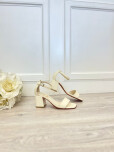 Sandalia taco bajo con pulsera con talon. Cuero manteca.