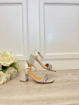 Sandalia taco bajo. Cuero plata minicrash .Con detalle de trenza strass plata.