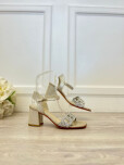 Sandalia taco bajo. Cuero plata minicrash con detalle de circulos de strass plata.