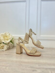 Sandalia taco medio con plataforma. Cuero platino minicrash con detalle de circulos de strass platino.