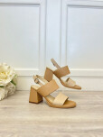 Sandalia taco medio con plataforma. Combinada en cuero beige con camel.