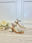 Sandalia taco bajo con detalle de hebilla. Combinada en cuero tiza y vison.