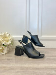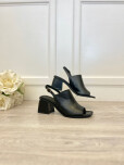 Sandalia taco medio con pulsera. Cuero charol negro.
