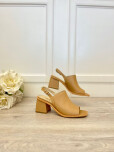 Sandalia taco medio con pulsera. Cuero graneado beige.