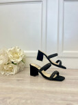 Sandalia taco bajo en cuero negro con brillo. Con detalle de doble tira strass negro.