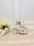 Sandalia taco medio en cuero plata con detalle de pulsera.