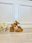 Sandalia taco medio con tiras cruzadas. Cuero graneado suela.