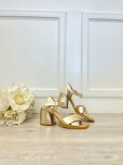Sandalia taco medio con tiras cruzadas. Cuero platino.