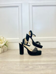 Sandalia taco alto con plataforma. Cuero cabra gamuzada negra con detalle de trenza strass negro.