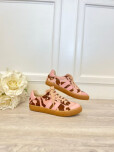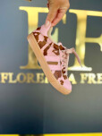 Zapatilla cuero pelo de vaca rosa con chocolate combinada con tiras en cuero rosa.
